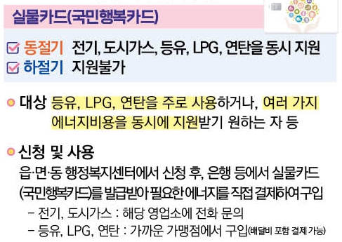- 실물카드형: 국민행복카드를 통해 연탄, 등유, LPG 등 다양한 연료를 직접 구입할 수 있습니다. 다만 카드 발급까지 약 2주가 걸리며, 분실 시 재발급이 필요합니다.