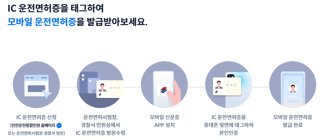 | IC 운전면허증 + NFC | IC 면허증 보유자 | ① IC 면허증 신청(도로교통공단·경찰서)② 앱 설치③ NFC 태그 → 생체 인증 → 발급 | 약 8,000원 | 스마트폰 교체 후 비대면 재발급 가능 | IC 면허증 신청 필요 |