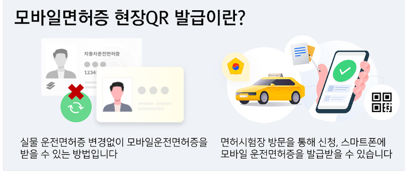 | QR코드 방식 (현장 발급) | 기존 면허증 보유자 | ① 시험장·경찰서 방문② 앱 설치③ QR코드 스캔 → 생체 인증 → 발급 | 약 1,000원 | 빠른 발급 가능 | 스마트폰 교체 시 재방문 필요 |