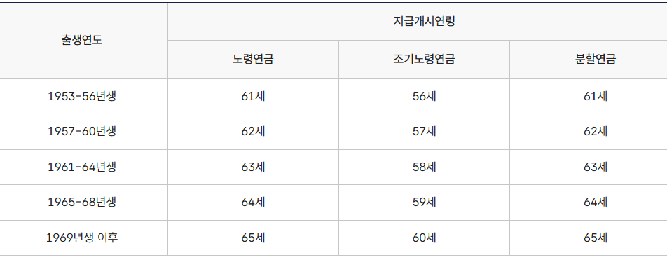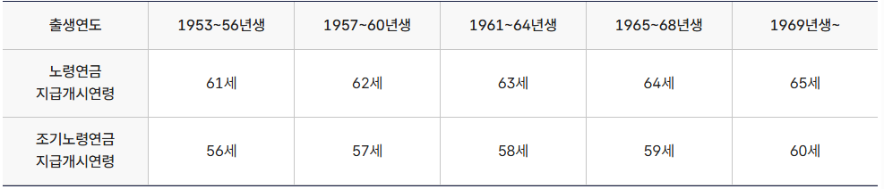 국민연금법 제64조에 따라, 노령연금의 수급 가능 연령은 출생연도에 따라 차등 적용되고 있으며, 아래의 표는 그 내용을 정리한 것입니다.