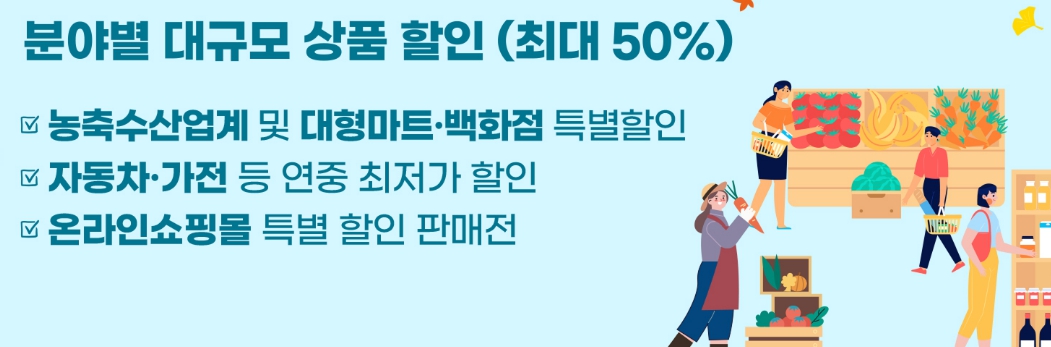 단순한 세일 행사가 아닌, 국민이 체감할 수 있는 품목 위주로 실속 있게 꾸려졌습니다. 김장철 식자재, 겨울철 간식, 가전제품, 자동차, 숙박, 문화서비스 등 전 세대가 참여할 수 있는 상품군이 폭넓게 포함되어 있습니다.