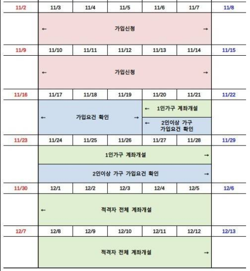 이번 신청 대상자 중 1인 가구는 11월 20일부터 12월 12일까지, 2인 이상 가구는 12월 1일부터 12월 12일까지 영업일에만 계좌 개설이 가능합니다. 심사는 신청 순서대로 진행되므로 가급적 조기에 신청하는 것이 유리합니다.