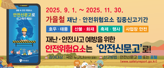 안전신문고는 국민이 직접 참여해 우리 사회의 안전을 만들어가는 대표적인 플랫폼입니다. “이 정도는 괜찮겠지” 하고 지나친 작은 위험이 큰 사고로 이어지지 않도록, 누구나 발견 즉시 신고하는 시민의식이 더 안전한 대한민국을 만듭니다. 오늘부터 스마트폰 속 안전신문고 앱을 통해 생활 속 위험을 발견하면 바로 신고하는 습관, 함께 시작해 보세요.