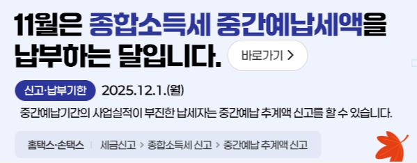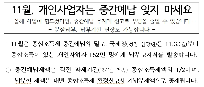 종합소득세 중간예납은 1년 단위로 납부하는 소득세를 미리 절반가량 내는 제도입니다. 직전 과세연도(2024년 귀속)의 종합소득세 확정세액의 절반이 올해 중간예납세액으로 산정됩니다. 국세청은 11월 3일부터 약 152만 명의 개인사업자에게 납부고지서를 발송하며, 납부기한은 12월 1일까지입니다.