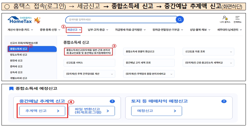- 홈택스: 로그인 → 세금신고 → 종합소득세 신고 → 중간예납 추계액 신고