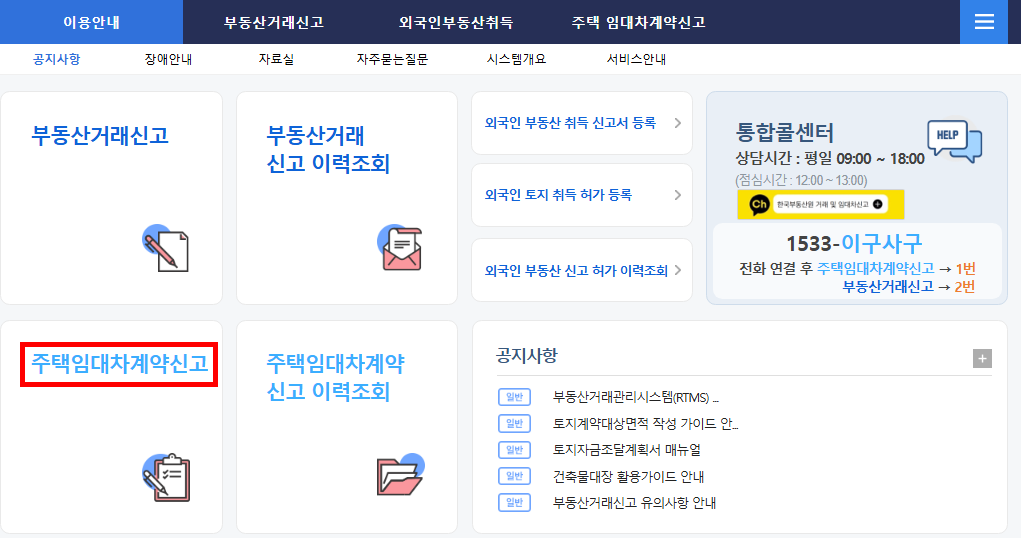 - '주택임대차 계약신고' 메뉴 선택