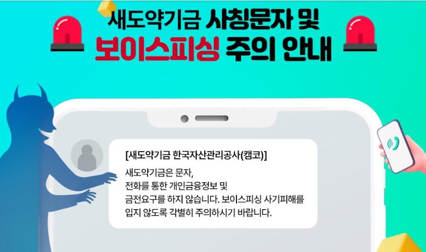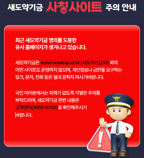 - 새도약기금은 별도 신청 없이 자동으로 적용됩니다. 개인 정보를 요구하거나 돈을 송금하라는 연락은 사기이므로 주의해야 합니다.