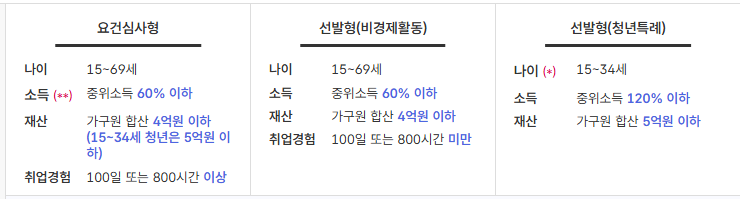 - 청년(15~34세)은 중위소득 120% 이하, 재산 5억 이하이며 취업경험 없어도 참여 가능