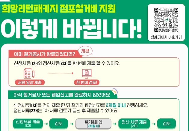 2025년 희망리턴패키지에서는 기존 3만 개사 지원 계획에서 1만 개사를 추가해 총 4만 개사에 철거비를 지원합니다. 지원금은 최대 400만 원까지로, 실제로 점포 철거 시 발생하는 원상복구비, 철거 인건비, 장비 사용료 등에 활용할 수 있습니다.